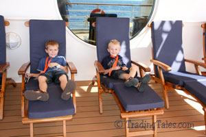 Our boys relax in the chairs on the promenade deck in the beautiful weather. They imagine what it must have been like with many people parading around the deck dressed in their finest.